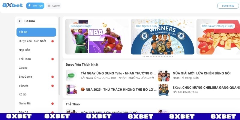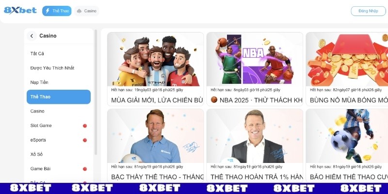Dù bạn yêu thích cá cược thể thao, casino trực tuyến, slot game, bắn cá, đá gà hay eSports, tất cả đều có mặt đầy đủ tại nhà cái 8xbet, sẵn sàng phục vụ 24/7.