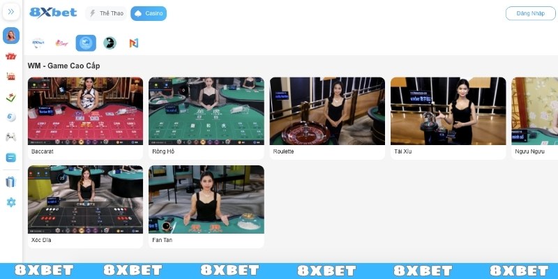 Với những ai yêu thích không khí sòng bài thật, casino trực tuyến tại 8xbet là điểm đến không thể bỏ qua. Các sảnh game như Evolution Gaming, Sexy Baccarat, SA Gaming, Pragmatic Play Live… đều được tích hợp ngay trên nền tảng của nhà cái.